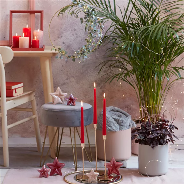 Dekoelemente wie kleine Schmuckbäumchen und Keramiksterne in Rot- und Rosétönen in Gruppen platziert, bringen den Trend „Stella“ auf den Tisch oder die Kommode.