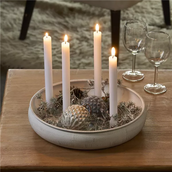 Es müssen nicht immer klassische Adventskränze sein. Im Weihnachtstrend „Soft Metallics“ passen sich auch festliche Schalen in die Weihnachtsdekoration mit ein. Die runde, weiße Magnet-Kerzenschale glänzt auf jedem Tisch und lädt zum individuellen Platzieren der Kerzen und anderen Accessoires ein. Besonders schön wirkt diese Schale auch mit Weihnachtskugeln.