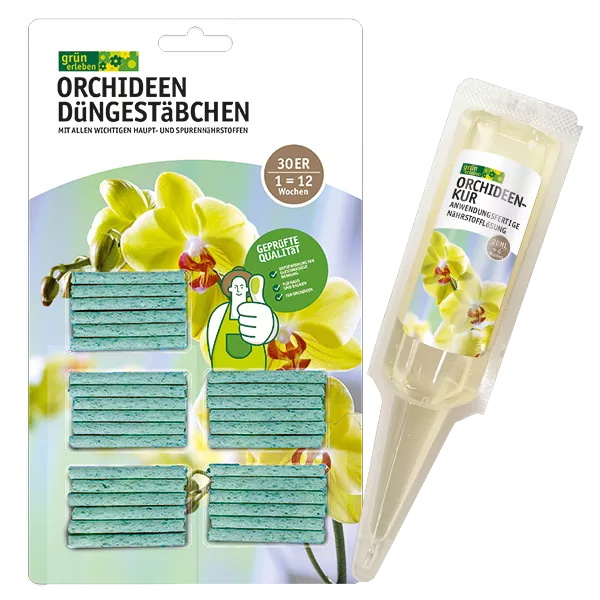 Düngen Sie die Blühpflanzen ca. alle drei Wochen mit den speziell auf die individuellen Bedürfnisse der Pflanzen abgestimmten grün erleben Düngern, z.B. der grün erleben ORCHIDEEN DüNGESTäBCHEN & ORCHIDEENKUR.