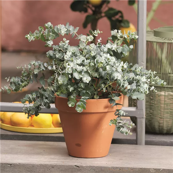 Durch sein schnelles Wachstum bringt dieser Busch spürbare Bewegung in mediterrane Pflanzungen. Der EUKALYPTUS-BUSCH (Eucalyptus gunnii) wirkt mit seinen silbrig-blauen Blättern leicht und modern und setzt einen ruhigen Gegenpol zu kräftigen Farben. Bei durchlässiger Erde, maßvollem Gießen und regelmäßigem Rückschnitt bleibt er kompakt und bildet immer wieder frisches Laub. Staunässe sollte vermieden werden.