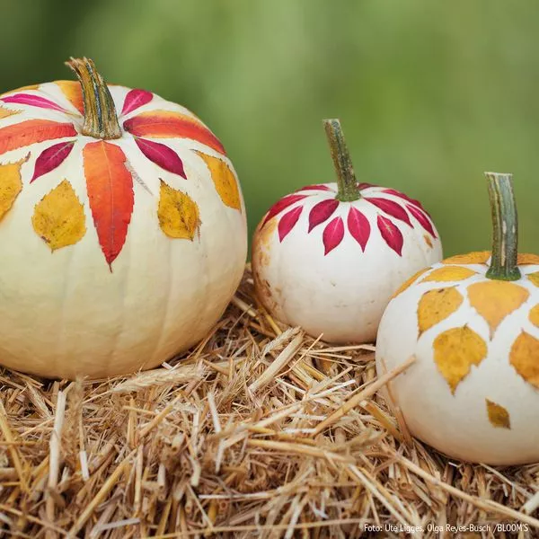 Dem Verzieren und Beschnitzen der Kürbisse sind keine Grenzen gesetzt. Besonders hübsch und bunt wird es, wenn vor allem die weißlichen Sorten mit den herbstlich verfärbten Blättern der Laubbäume beklebt sind. Wer schlichten Holzleim dafür verwendet, kann hinterher noch das innere Fleisch der Kürbisse für die Zubereitung von Gerichten verwenden.